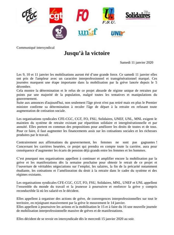 Le succès de la mobilisation commencée le 5 décembre est indéniable, continuons toutes et tous la grève et les actions le 14 janvier et les jours suivants ! Les organisations syndicales et de jeunesse continuent leur plan d'actions contre le projet de réforme de retraites par points, et pour gagner un renforcement et une amélioration du système actuel de retraites, solidaire et intergénérationnel.