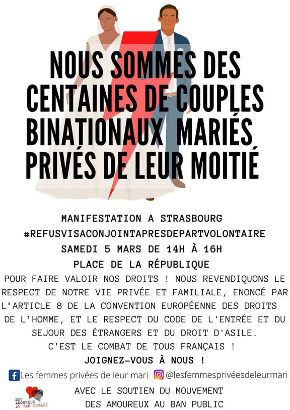 À l'appel des collectifs "Les femmes privées de leur mari" et "Refus visa conjoint francais en Tunisie", avec le soutien du mouvement des Amoureux au ban public, et suite à des manifestations devant l'Ambassade de France à Tunis: rassemblement samedi 5 mars 2022 de 14 h à 16 h place de la République à Strasbourg pour dénoncer le refus de visa après départ volontaire.