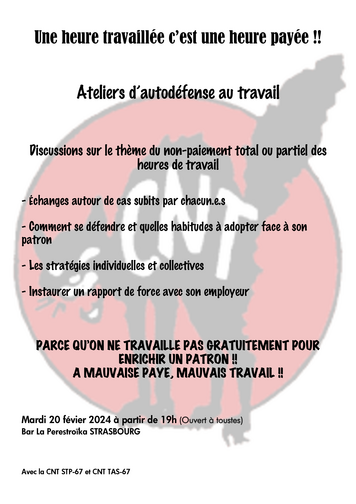 La CNT-STP67 (Syndicat des travailleur.euse.s et précaires du Bas-Rhin) et la CNT-TAS67 (Syndicat Travail et Affaires Sociales Alsace) organise son premier atelier d'autodéfense au travail, ouvert à toutes et tous, même si vous n'êtes pas syndiqué.e.